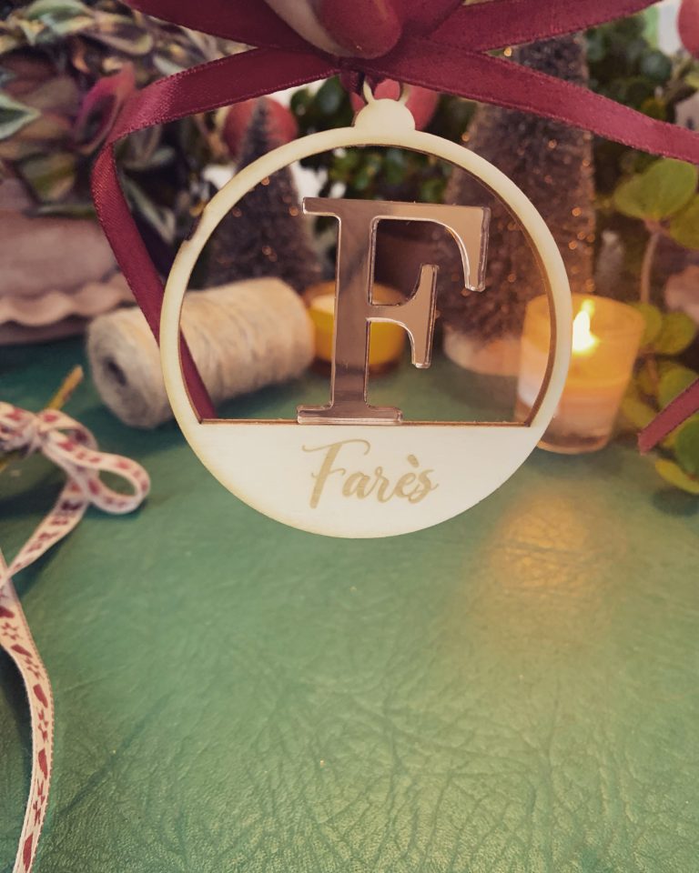 Boule de Noël en bois et plexiglas à personnaliser avec prénom plus la première lettre de celui ci .