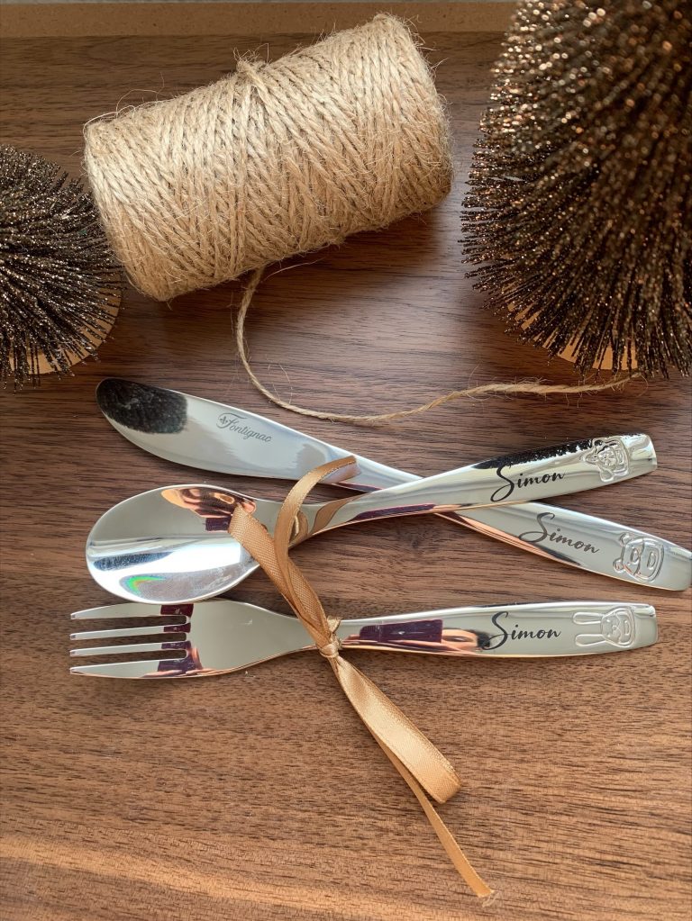 • un jolie motif sur chaque couvert , le prénom de votre enfant gravé