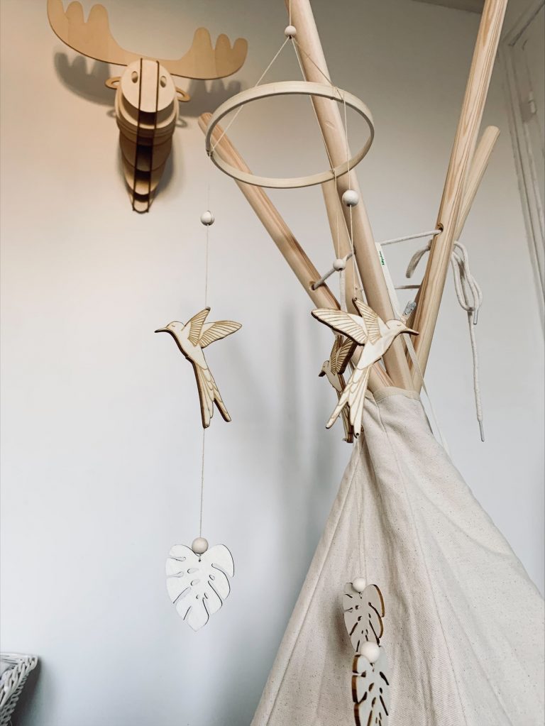 Ce magnifique mobile bébé en bois, collection tropical avec son design naturel et poétique s’accordera à toutes les décorations. Vous pouvez l’accrocher dans la chambre de bébé, au dessus du lit ou de sa table à langer. Il accompagnera bébé dans son éveil tout en douceur.
